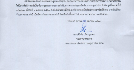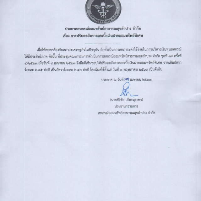 ประกาศสหกรณ์ออมทรัพย์สาธารณสุขลำปาง จำกัด เรื่องการปรับลดอัตราดอกเบี้ยเงินฝากออมทรัพย์พิเศษ เพื่อให้สอดคล้องกับสภาวะเศรษฐกิจในปัจจุบัน