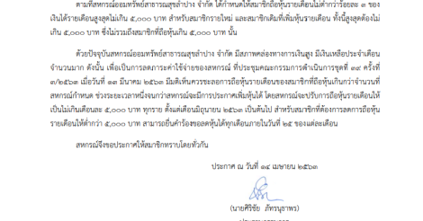 ประกาศสหกรณ์ออมทรัพย์สาธารณสุขลำปาง จำกัด การถือหุ้นรายเดือนของสมาชิก