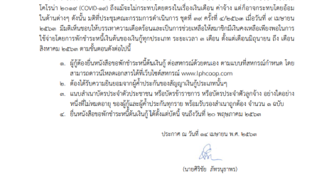 ประกาศสหกรณ์ออมทรัพย์สาธารณสุขลำปาง จำกัด การพักชำระหนี้ต้นเงินกู้ เพื่อให้สอดคล้องกับสภาวะเศรษฐกิจในปัจจุบัน