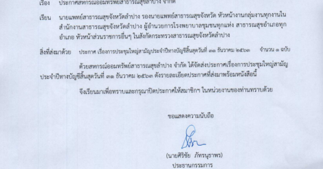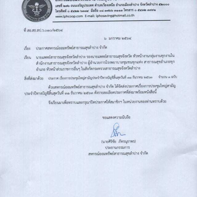 สหกรณ์ออมทรัพย์สาธารณสุขลำปาง จำกัด ขอเลื่อนการประชุมใหญ่สามัญประจำปีทางบัญชีสิ้นสุดวันที่ 31 ธันวาคม 2563 จากกำหนดการเดิมออกไปจนกว่าสถานการณ์การแพร่ระบาด COVID-19 จะเบาบาง และได้รับอนุญาตจากผู้ว่าราชการจังหวัดลำปาง ให้ดำเนินการประชุมใหญ่สามัญประจำปีทางบัญชี สิ้นสุดวันที่ 31 ธันวาคม 2563