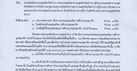 สหกรณ์ออมทรัพท์สาธารณสุขลำปาง จำกัด จะมีการมอบทุนส่งเสริมการศึกษาบุตรสมาชิก ปี 2564 โดยเปิดให้สมาชิกยื่นใบสมัครตั้งแต่วันที่ 2-31 สิงหาคม 2564 รายละเอียดตามประกาศนี้