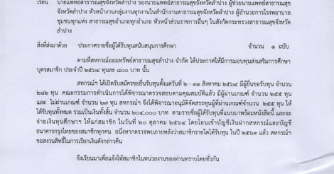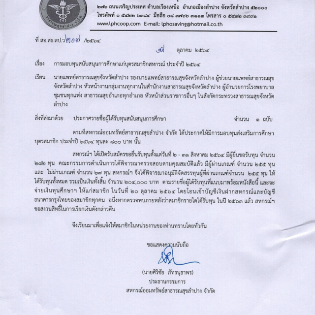 สหกรณ์ออมทรัพท์สาธารณสุขลำปาง จำกัด ได้พิจารณาอนุมัติจัดสรรทุนการศึกษาบุตรสมาชิก ประจำปี 2564 จำนวน 255 ทุน จำนวนเงิน 204,000 บาท ตามรายชื่อผุ้ได้รับทุนที่แนบมาพร้อมนี้ และจะจ่ายเงินให้สมาชิกในวันที่ 20 ตุลาคม 2564 โดยโอนเข้าบัญชีเงินฝากสหกรณ์ และบัญชีธนาคารกรุงไทยของสมาชิกทุกคน