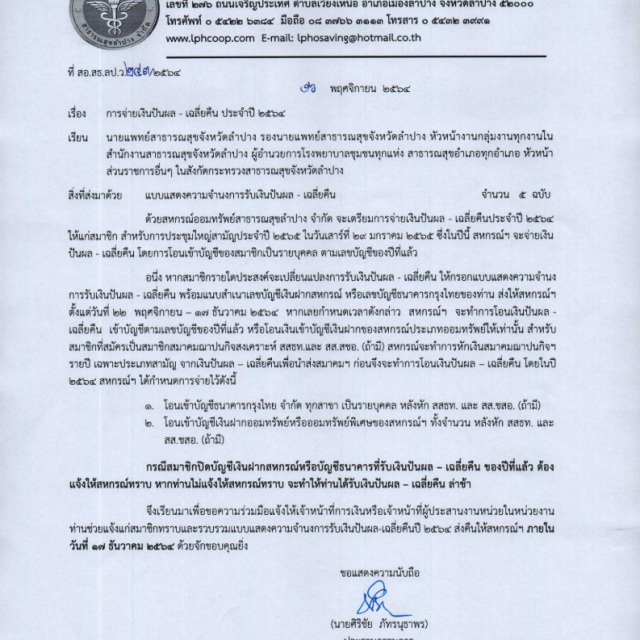 สหกรณ์ออมทรัพย์สาธารณสุขลำปาง จำกัด เตรียมการจ่ายเงินปันผล-เฉลี่ยคืน ประจำปี 2564 ให้แก่สมาชิก สำหรับการประชุมใหญ่สามัญประจำปี 2564 ในวันเสาร์ที่ 29 มกราคม 2564