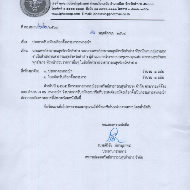 ปี 2565 คณะกรรมการสหกรณ์ออมทรัพย์สาธารณสุขลำปาง จำกัด ครบวาระที่ต้องออก จำนวน 8 คน สหกรณ์จึงประกาศรับสมัครสมาชิกที่ประสงค์จะสมัครเลือกตั้งเป็นคณะกรรมการสหกรณ์ฯ รายละเอียดตามเอกสารแนบด้านล่างนี้