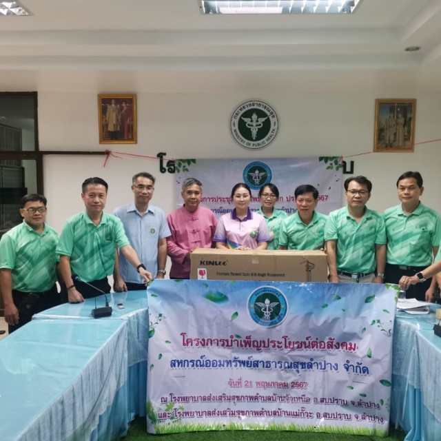 ที่ 21 พฤษภาคม 2567 สหกรณ์ออมทรัพย์สาธารณสุขลาปาง จากัด นำโดยนายนิเวศย์ ตันตาปกุล ประธานกรรมการ และคณะกรรมการดำเนินงาน ได้ดำเนินโครงการบำเพ็ญประโยชน์ต่อสังคม โดยการมอบเครื่องมือแพทย์ เพื่อใช้บริการประชาชนในพื้นที่ ให้กับโรงพยาบาลส่งเสริมสุขภาพตำบล 2 แห่ง ในอำเภอสบปราบ ได้แก่ โรงพยาบาลส่งเสริมสุขภาพตำบลบ้านจัวเหนือ และโรงพยาบาลส่งเสริมสุขภาพตำบลแม่กั๊ว