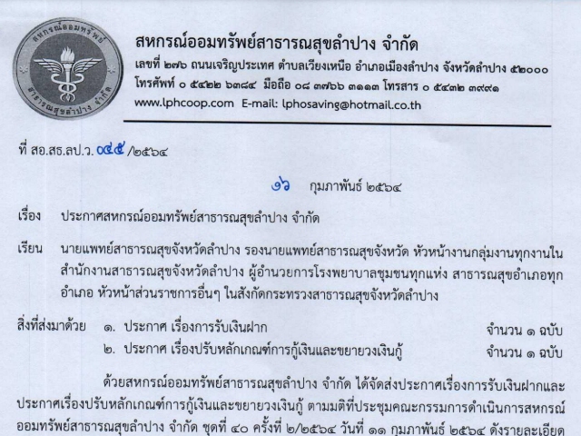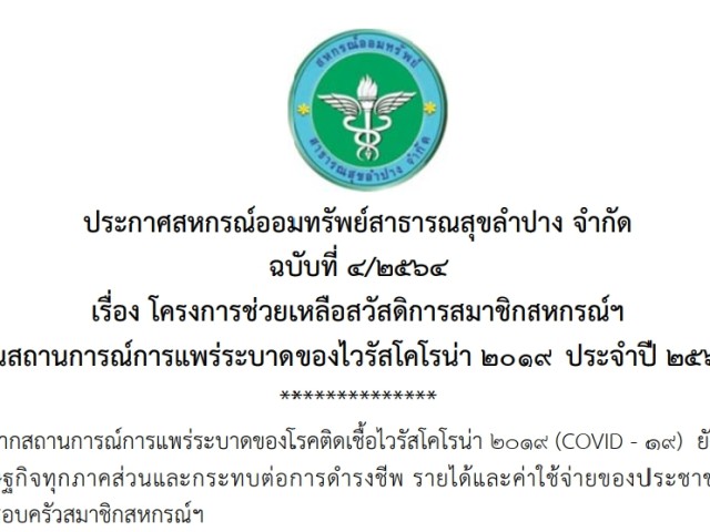 สหกรณ์ออมทรัพย์สาธารณสุขลำปาง จำกัด ประกาศโครงการช่วยเหลือสมาชิกสหกรณ์ฯที่ได้รับผลกระทบจากการระบาดโร...