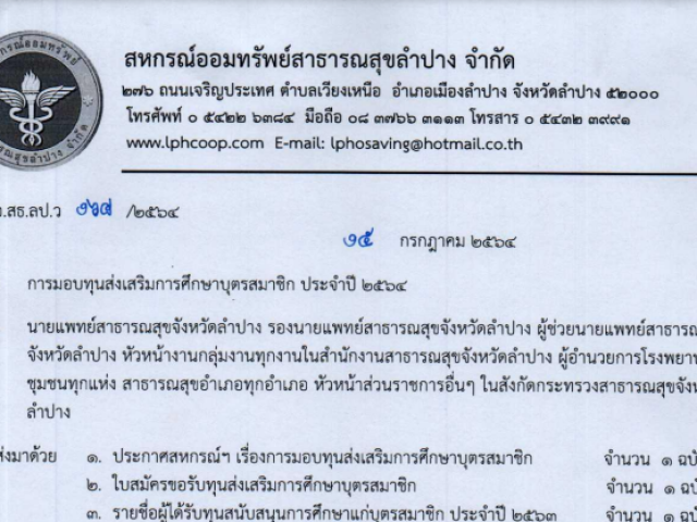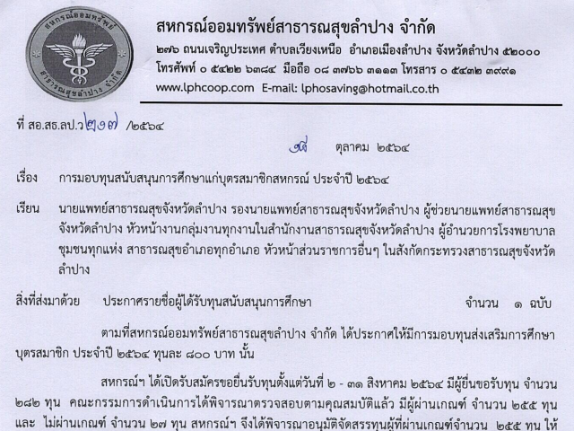 สหกรณ์ออมทรัพท์สาธารณสุขลำปาง จำกัด ได้พิจารณาอนุมัติจัดสรรทุนการศึกษาบุตรสมาชิก ประจำปี 2564 จำนวน ...