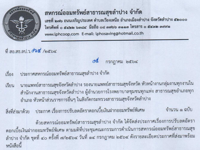 สหกรณ์ออมทรัพท์สาธารณสุขลำปาง จำกัด ประกาศปรับลดอัตราดอกเบี้ยเงินฝากออมทรัพย์พิเศษ ณ วันที่ 15 กรกฎา...
