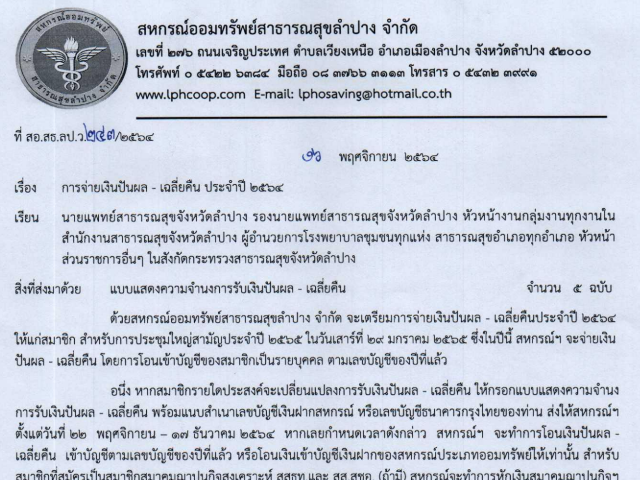 สหกรณ์ออมทรัพย์สาธารณสุขลำปาง จำกัด เตรียมการจ่ายเงินปันผล-เฉลี่ยคืน ประจำปี 2564 ให้แก่สมาชิก สำหรั...
