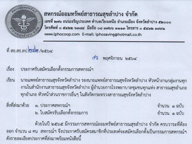 ปี 2565 คณะกรรมการสหกรณ์ออมทรัพย์สาธารณสุขลำปาง จำกัด ครบวาระที่ต้องออก จำนวน 8 คน สหกรณ์จึงประกาศรั...