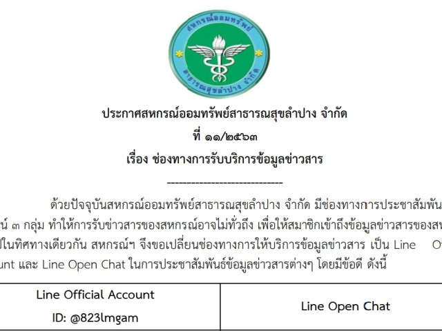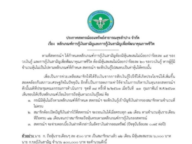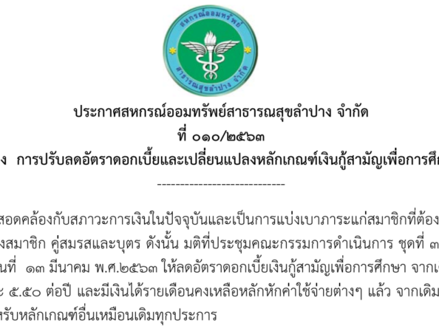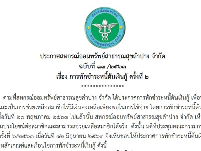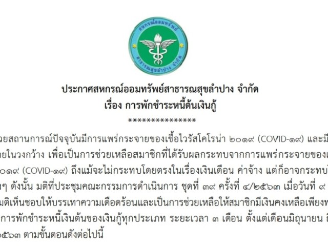 ประกาศสหกรณ์ออมทรัพย์สาธารณสุขลำปาง จำกัด การพักชำระหนี้ต้นเงินกู้ เพื่อให้สอดคล้องกับสภาวะเศรษฐกิจใ...