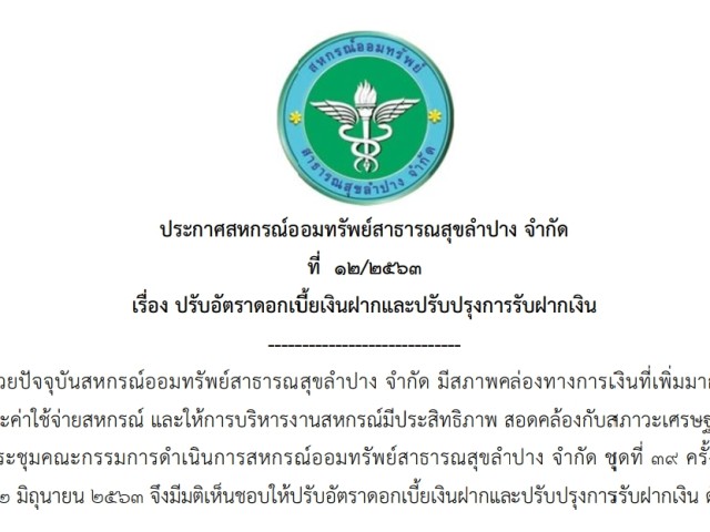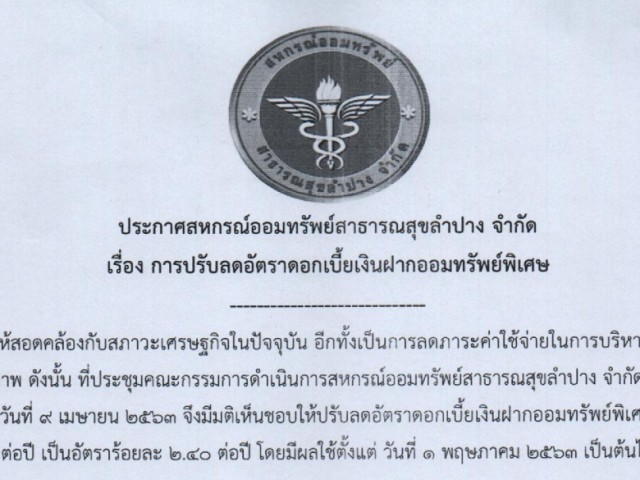 ประกาศสหกรณ์ออมทรัพย์สาธารณสุขลำปาง จำกัด เรื่องการปรับลดอัตราดอกเบี้ยเงินฝากออมทรัพย์พิเศษ เพื่อให้...