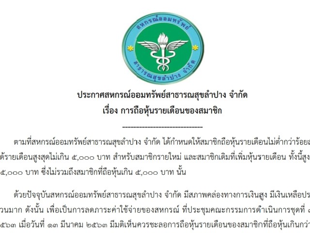 ประกาศสหกรณ์ออมทรัพย์สาธารณสุขลำปาง จำกัด การถือหุ้นรายเดือนของสมาชิก